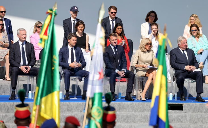 Bruno Le Maire, Gabriel Attal, Amélie Oudea-Castera, Prisca Thévenot, Aurore Bergé, Emmanuel Macron et sa Brigitte, Gérard Larcher en tribune présidentielle lors de la cérémonie du 144ème défilé militaire du 14 juillet, jour de la Fête Nationale, avenue Foch à Paris, France, le 14 juillet 2024. © Dominique Jacovides/Bestimage French President, his wife and Ministers during the Bastille Day parade, in Paris, France, on July 14, 2024.
