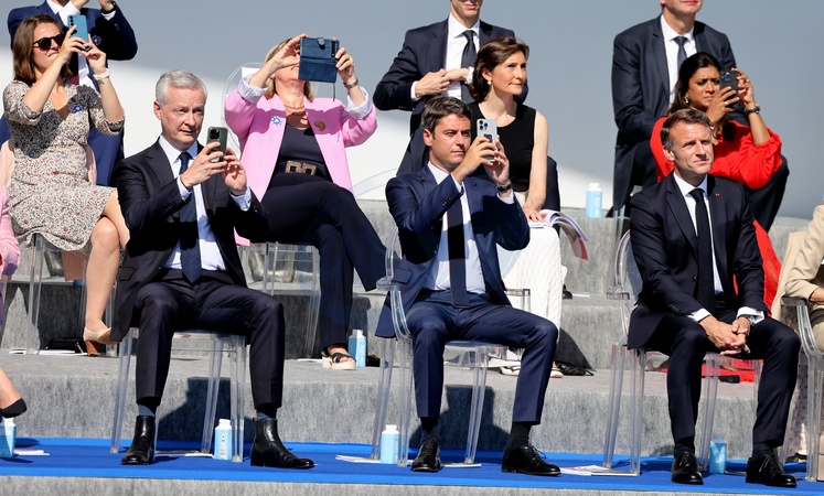 Bruno Le Maire, Gabriel Attal, Sylvie Retailleau, Amélie Oudea-Castera, Prisca Thévenot, Emmanuel Macron en tribune présidentielle lors de la cérémonie du 144ème défilé militaire du 14 juillet, jour de la Fête Nationale, avenue Foch à Paris, France, le 14 juillet 2024. © Dominique Jacovides/Bestimage French President, his wife and Ministers during the Bastille Day parade, in Paris, France, on July 14, 2024.