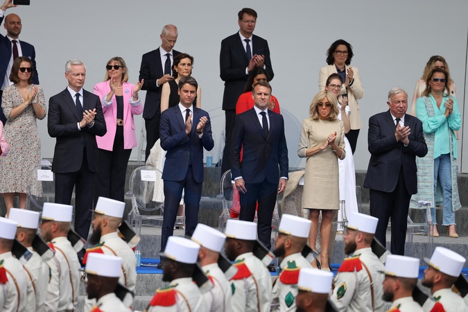 Bruno Le Maire, Sylvie Retailleau, Gabriel Attal, Amélie Oudea-Castera, Franck Riester, Prisca Thévenot, Aurore Bergé, Emmanuel Macron et sa Brigitte, Gérard Larcher en tribune présidentielle lors de la cérémonie du 144ème défilé militaire du 14 juillet, jour de la Fête Nationale, avenue Foch à Paris, France, le 14 juillet 2024. © Dominique Jacovides/Bestimage French President, his wife and Ministers during the Bastille Day parade, in Paris, France, on July 14, 2024.