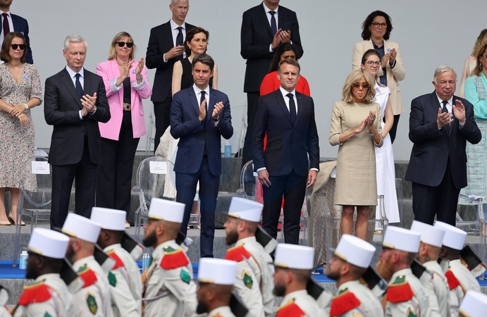 Bruno Le Maire, Sylvie Retailleau, Gabriel Attal, Amélie Oudea-Castera, Franck Riester, Prisca Thévenot, Aurore Bergé, Emmanuel Macron et sa Brigitte, Gérard Larcher en tribune présidentielle lors de la cérémonie du 144ème défilé militaire du 14 juillet, jour de la Fête Nationale, avenue Foch à Paris, France, le 14 juillet 2024. © Dominique Jacovides/Bestimage French President, his wife and Ministers during the Bastille Day parade, in Paris, France, on July 14, 2024.