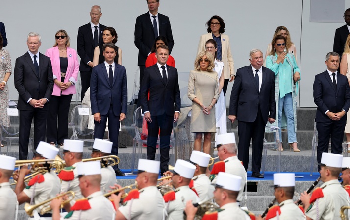 Bruno Le Maire, Gabriel Attal, Emmanuel Macron, Brigitte Macron, Gérard Larcher, Gérald Darmanin, Sylvie Retailleau, Franck Riester, Amélie Oudéa-Castéra, Prisca Thevenot en tribune présidentielle lors de la cérémonie du 144ème défilé militaire du 14 juillet, jour de la Fête Nationale, avenue Foch à Paris, France, le 14 juillet 2024. © Dominique Jacovides/Bestimage French President, his wife and Ministers during the Bastille Day parade, in Paris, France, on July 14, 2024.