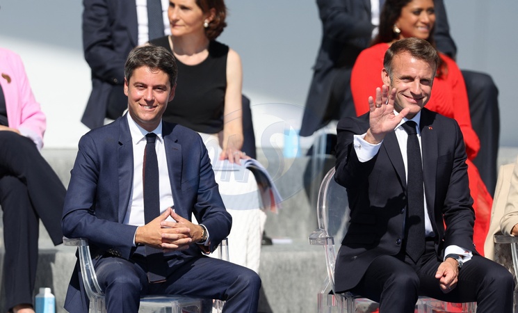 Gabriel Attal, Emmanuel Macron en tribune présidentielle lors de la cérémonie du 144ème défilé militaire du 14 juillet, jour de la Fête Nationale, avenue Foch à Paris, France, le 14 juillet 2024. © Dominique Jacovides/Bestimage French President, his wife and Ministers during the Bastille Day parade, in Paris, France, on July 14, 2024.