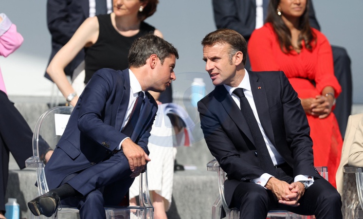 Gabriel Attal, Emmanuel Macron en tribune présidentielle lors de la cérémonie du 144ème défilé militaire du 14 juillet, jour de la Fête Nationale, avenue Foch à Paris, France, le 14 juillet 2024. © Dominique Jacovides/Bestimage French President, his wife and Ministers during the Bastille Day parade, in Paris, France, on July 14, 2024.