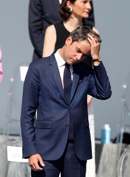 Gabriel Attal en tribune présidentielle lors de la cérémonie du 144ème défilé militaire du 14 juillet, jour de la Fête Nationale, avenue Foch à Paris, France, le 14 juillet 2024. © Dominique Jacovides/Bestimage French President, his wife and Ministers during the Bastille Day parade, in Paris, France, on July 14, 2024.