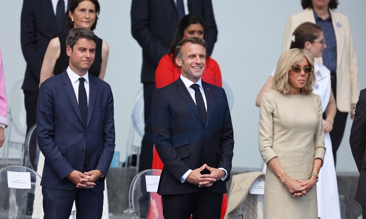 Gabriel Attal, Emmanuel Macron et sa femme Brigitte en tribune présidentielle lors de la cérémonie du 144ème défilé militaire du 14 juillet, jour de la Fête Nationale, avenue Foch à Paris, France, le 14 juillet 2024. © Dominique Jacovides/Bestimage French President, his wife and Ministers during the Bastille Day parade, in Paris, France, on July 14, 2024.