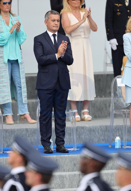 Gérald Darmanin en tribune présidentielle lors de la cérémonie du 144ème défilé militaire du 14 juillet, jour de la Fête Nationale, avenue Foch à Paris, France, le 14 juillet 2024. © Dominique Jacovides/Bestimage French President, his wife and Ministers during the Bastille Day parade, in Paris, France, on July 14, 2024.