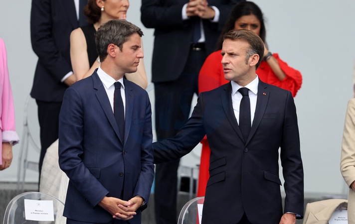Gabriel Attal, Emmanuel Macron en tribune présidentielle lors de la cérémonie du 144ème défilé militaire du 14 juillet, jour de la Fête Nationale, avenue Foch à Paris, France, le 14 juillet 2024. © Dominique Jacovides/Bestimage French President, his wife and Ministers during the Bastille Day parade, in Paris, France, on July 14, 2024.