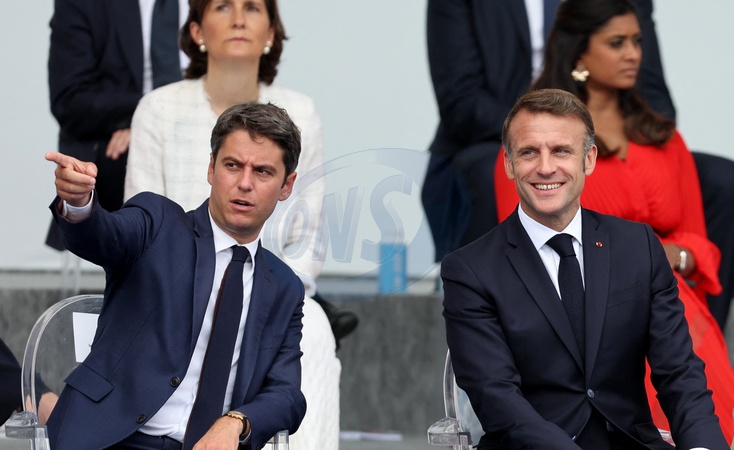Gabriel Attal, Emmanuel Macron en tribune présidentielle lors de la cérémonie du 144ème défilé militaire du 14 juillet, jour de la Fête Nationale, avenue Foch à Paris, France, le 14 juillet 2024. © Dominique Jacovides/Bestimage French President, his wife and Ministers during the Bastille Day parade, in Paris, France, on July 14, 2024.