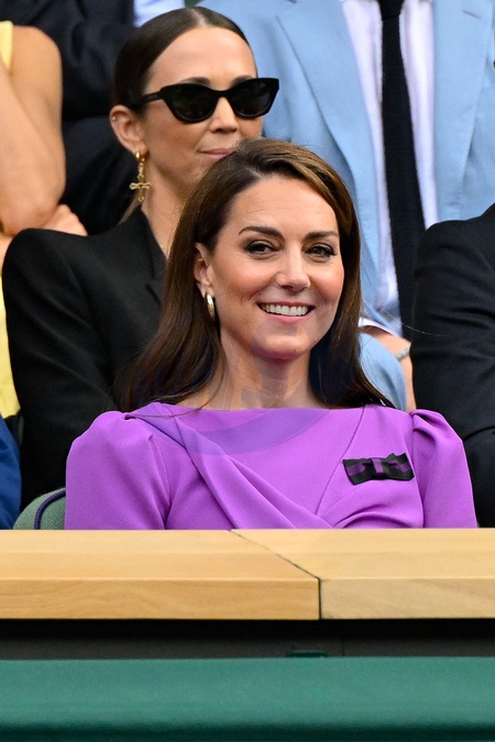 Catherine (Kate) Middleton avec la princesse Charlotte et Pippa Middleton dans les tribunes de la finale du tournoi de Wimbledon 2024, le 14 juillet 2024. Catherine (Kate) Middleton with Princess Charlotte and Pippa Middleton in the stands of the final of the 2024 Wimbledon tournament, July 14, 2024.