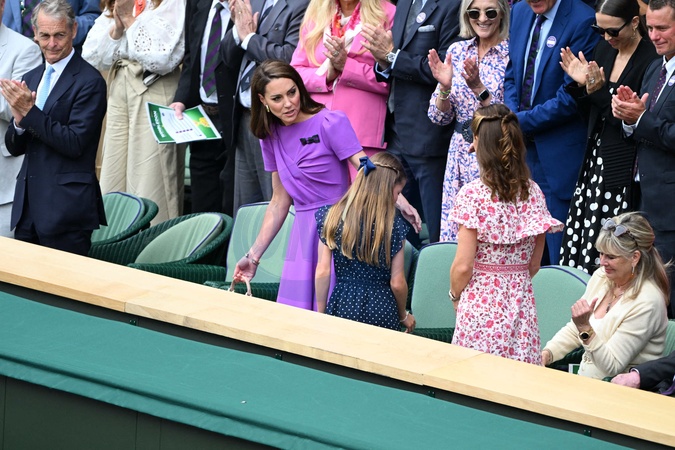 Catherine (Kate) Middleton avec la princesse Charlotte et Pippa Middleton dans les tribunes de la finale du tournoi de Wimbledon 2024, le 14 juillet 2024. Catherine (Kate) Middleton with Princess Charlotte and Pippa Middleton in the stands of the final of the 2024 Wimbledon tournament, July 14, 2024.