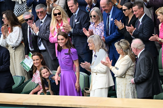 Catherine (Kate) Middleton avec la princesse Charlotte et Pippa Middleton dans les tribunes de la finale du tournoi de Wimbledon 2024, le 14 juillet 2024. Catherine (Kate) Middleton with Princess Charlotte and Pippa Middleton in the stands of the final of the 2024 Wimbledon tournament, July 14, 2024.