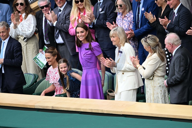 Catherine (Kate) Middleton avec la princesse Charlotte et Pippa Middleton dans les tribunes de la finale du tournoi de Wimbledon 2024, le 14 juillet 2024. Catherine (Kate) Middleton with Princess Charlotte and Pippa Middleton in the stands of the final of the 2024 Wimbledon tournament, July 14, 2024.