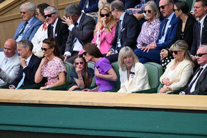 Catherine (Kate) Middleton avec la princesse Charlotte et Pippa Middleton dans les tribunes de la finale du tournoi de Wimbledon 2024, le 14 juillet 2024. Catherine (Kate) Middleton with Princess Charlotte and Pippa Middleton in the stands of the final of the 2024 Wimbledon tournament, July 14, 2024.