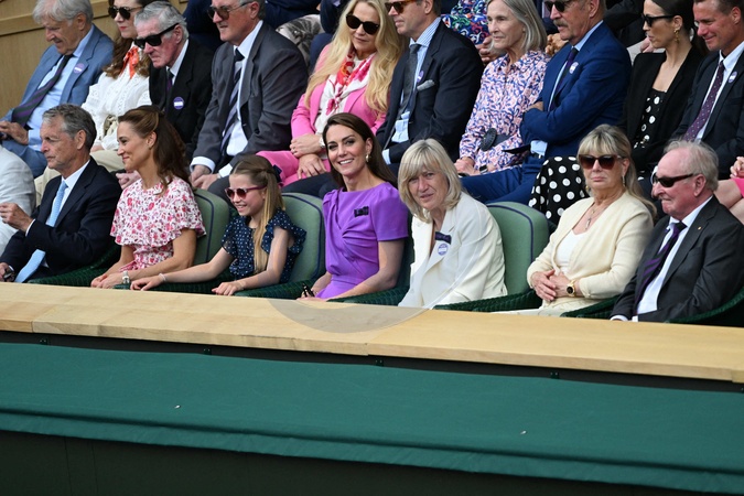 Catherine (Kate) Middleton avec la princesse Charlotte et Pippa Middleton dans les tribunes de la finale du tournoi de Wimbledon 2024, le 14 juillet 2024. Catherine (Kate) Middleton with Princess Charlotte and Pippa Middleton in the stands of the final of the 2024 Wimbledon tournament, July 14, 2024.