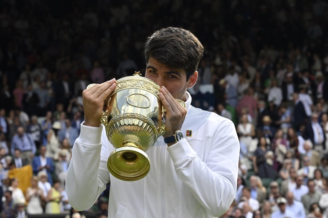 Catherine (Kate) Middleton wręcza puchar Carlosowi Alcarazowi po jego zwycięstwie nad Novakiem Djokoviciem w finale turnieju Wimbledonu 2024 (6.2. - 6.2. - 7.6