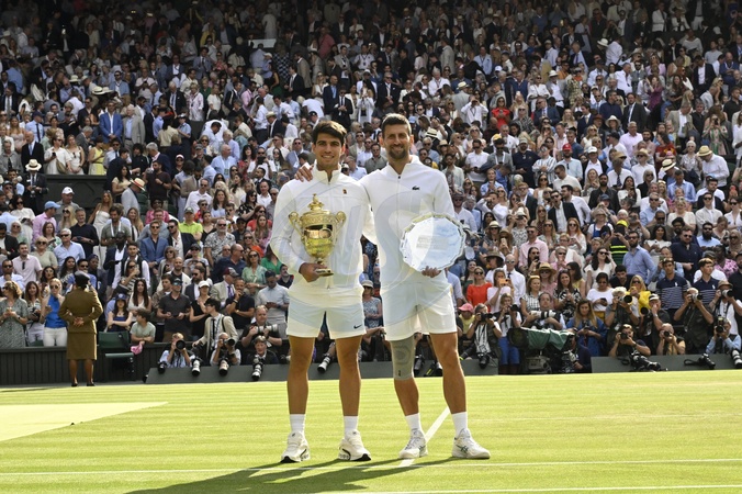 Catherine (Kate) Middleton wręcza puchar Carlosowi Alcarazowi po jego zwycięstwie nad Novakiem Djokoviciem w finale turnieju Wimbledonu 2024 (6.2. - 6.2. - 7.6