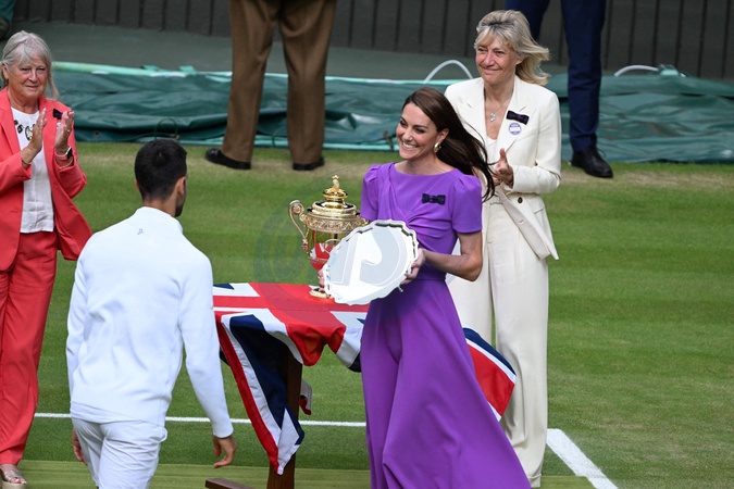 Catherine (Kate) Middleton remet la coupe à Carlos Alcaraz après sa victoire face à Novak Djokovic en finale du tournoi de Wimbledon 2024 (6/2 - 6/2 - 7/6)