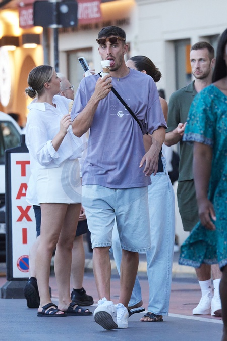 Exclusif - Kai Havertz (joueur de foot de l'équipe nationale allemande et de Chelsea) et sa compagne Sofia Weber mangent une glace en se baladant avec des amis sur le port de Saint-Tropez, le 11 juillet 2024. Exclusive - Germany call for price - Kai Havertz (soccer player for the German national team and Chelsea) and his partner Sofia Weber eat an ice cream while walking with friends on the port of Saint-Tropez, July 11, 2024 .