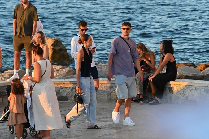 Exclusif - Kai Havertz (joueur de foot de l'équipe nationale allemande et de Chelsea) et sa compagne Sofia Weber mangent une glace en se baladant avec des amis sur le port de Saint-Tropez, le 11 juillet 2024. Exclusive - Germany call for price - Kai Havertz (soccer player for the German national team and Chelsea) and his partner Sofia Weber eat an ice cream while walking with friends on the port of Saint-Tropez, July 11, 2024 .
