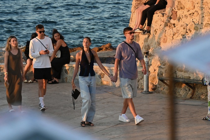 Exclusif - Kai Havertz (joueur de foot de l'équipe nationale allemande et de Chelsea) et sa compagne Sofia Weber mangent une glace en se baladant avec des amis sur le port de Saint-Tropez, le 11 juillet 2024. Exclusive - Germany call for price - Kai Havertz (soccer player for the German national team and Chelsea) and his partner Sofia Weber eat an ice cream while walking with friends on the port of Saint-Tropez, July 11, 2024 .
