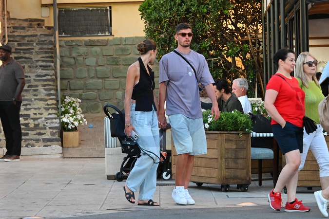 Exclusif - Kai Havertz (joueur de foot de l'équipe nationale allemande et de Chelsea) et sa compagne Sofia Weber mangent une glace en se baladant avec des amis sur le port de Saint-Tropez, le 11 juillet 2024. Exclusive - Germany call for price - Kai Havertz (soccer player for the German national team and Chelsea) and his partner Sofia Weber eat an ice cream while walking with friends on the port of Saint-Tropez, July 11, 2024 .