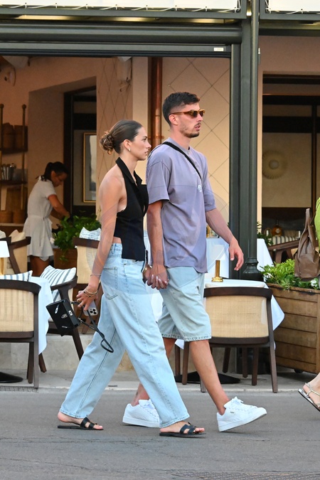 Exclusif - Kai Havertz (joueur de foot de l'équipe nationale allemande et de Chelsea) et sa compagne Sofia Weber mangent une glace en se baladant avec des amis sur le port de Saint-Tropez, le 11 juillet 2024. Exclusive - Germany call for price - Kai Havertz (soccer player for the German national team and Chelsea) and his partner Sofia Weber eat an ice cream while walking with friends on the port of Saint-Tropez, July 11, 2024 .