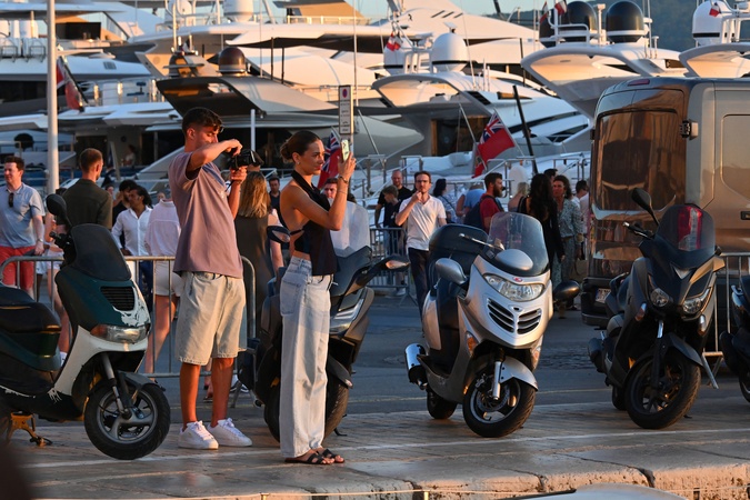 Exclusif - Kai Havertz (joueur de foot de l'équipe nationale allemande et de Chelsea) et sa compagne Sofia Weber mangent une glace en se baladant avec des amis sur le port de Saint-Tropez, le 11 juillet 2024. Exclusive - Germany call for price - Kai Havertz (soccer player for the German national team and Chelsea) and his partner Sofia Weber eat an ice cream while walking with friends on the port of Saint-Tropez, July 11, 2024 .