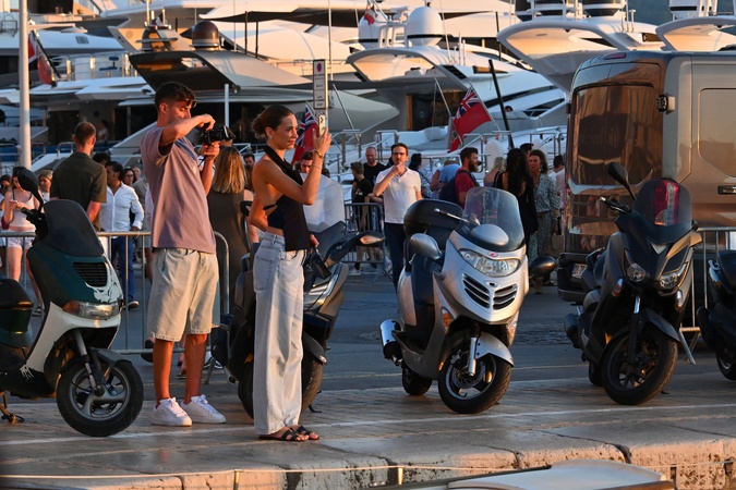 Exclusif - Kai Havertz (joueur de foot de l'équipe nationale allemande et de Chelsea) et sa compagne Sofia Weber mangent une glace en se baladant avec des amis sur le port de Saint-Tropez, le 11 juillet 2024. Exclusive - Germany call for price - Kai Havertz (soccer player for the German national team and Chelsea) and his partner Sofia Weber eat an ice cream while walking with friends on the port of Saint-Tropez, July 11, 2024 .
