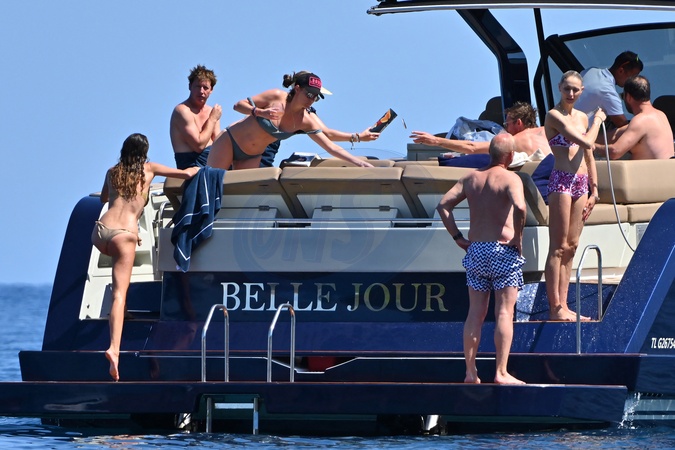 Exclusif - James Blunt, sa femme Sofia Wellesley et des amis profitent d'une belle journée à bord du yacht "Belle Jour" dans le Golfe de Saint-Tropez, Côte d'Azur, France, le 15 juillet 2024. James a profité jusqu'à 19h avant son concert à Cannes ce soir. No Web pour la Belgique et la Suisse Exclusive - For Germany Call For Price - James Blunt, his wife Sofia Wellesley and friends enjoy a lovely day aboard the yacht 'Belle Jour' in the Gulf of Saint-Tropez, French Riviera, France on July 15, 2024. James enjoyed until 7 p.m. before his concert in Cannes this evening.