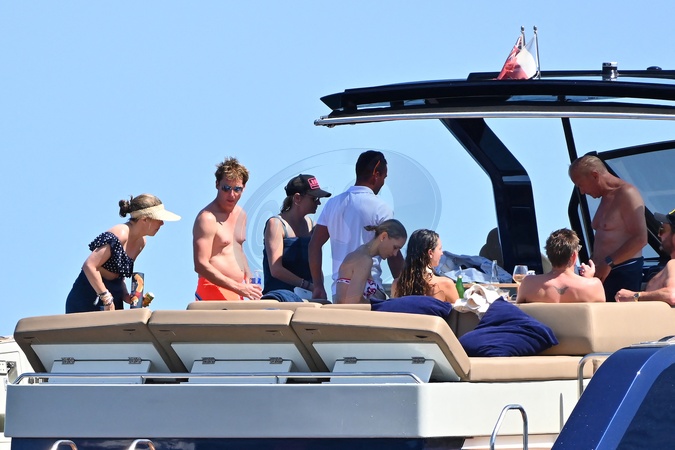 Exclusif - James Blunt, sa femme Sofia Wellesley et des amis profitent d'une belle journée à bord du yacht "Belle Jour" dans le Golfe de Saint-Tropez, Côte d'Azur, France, le 15 juillet 2024. James a profité jusqu'à 19h avant son concert à Cannes ce soir. No Web pour la Belgique et la Suisse Exclusive - For Germany Call For Price - James Blunt, his wife Sofia Wellesley and friends enjoy a lovely day aboard the yacht 'Belle Jour' in the Gulf of Saint-Tropez, French Riviera, France on July 15, 2024. James enjoyed until 7 p.m. before his concert in Cannes this evening.
