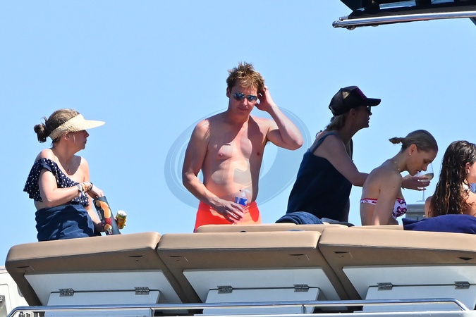 Exclusif - James Blunt, sa femme Sofia Wellesley et des amis profitent d'une belle journée à bord du yacht "Belle Jour" dans le Golfe de Saint-Tropez, Côte d'Azur, France, le 15 juillet 2024. James a profité jusqu'à 19h avant son concert à Cannes ce soir. No Web pour la Belgique et la Suisse Exclusive - For Germany Call For Price - James Blunt, his wife Sofia Wellesley and friends enjoy a lovely day aboard the yacht 'Belle Jour' in the Gulf of Saint-Tropez, French Riviera, France on July 15, 2024. James enjoyed until 7 p.m. before his concert in Cannes this evening.