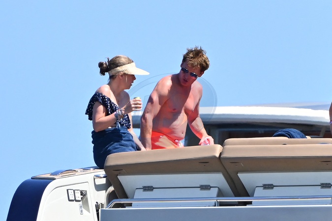 Exclusif - James Blunt, sa femme Sofia Wellesley et des amis profitent d'une belle journée à bord du yacht "Belle Jour" dans le Golfe de Saint-Tropez, Côte d'Azur, France, le 15 juillet 2024. James a profité jusqu'à 19h avant son concert à Cannes ce soir. No Web pour la Belgique et la Suisse Exclusive - For Germany Call For Price - James Blunt, his wife Sofia Wellesley and friends enjoy a lovely day aboard the yacht 'Belle Jour' in the Gulf of Saint-Tropez, French Riviera, France on July 15, 2024. James enjoyed until 7 p.m. before his concert in Cannes this evening.