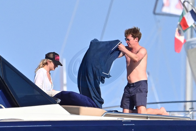 Exclusif - James Blunt, sa femme Sofia Wellesley et des amis profitent d'une belle journée à bord du yacht "Belle Jour" dans le Golfe de Saint-Tropez, Côte d'Azur, France, le 15 juillet 2024. James a profité jusqu'à 19h avant son concert à Cannes ce soir. No Web pour la Belgique et la Suisse Exclusive - For Germany Call For Price - James Blunt, his wife Sofia Wellesley and friends enjoy a lovely day aboard the yacht 'Belle Jour' in the Gulf of Saint-Tropez, French Riviera, France on July 15, 2024. James enjoyed until 7 p.m. before his concert in Cannes this evening.