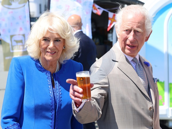 ST PETER PORT, GUERNSEY - JULY 16: Queen Camilla and King Charles III sample local ale during a tour of the Island showcase exhibition, a showcase of Guernsey culture, heritage, produce and environmental initiatives on Crown Pier during an official visit to Guernsey on July 16, 2024 in St Peter Port, Guernsey., Credit:Chris Jackson / Avalon