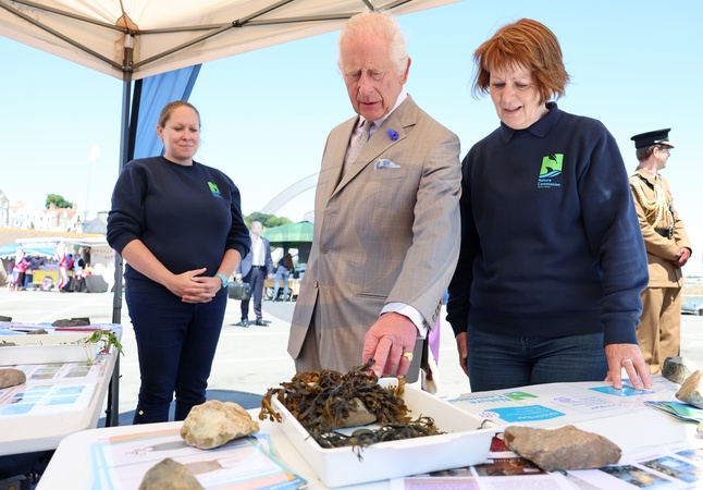 ST PETER PORT, GUERNSEY - JULY 16: King Charles III meets with members of the Nature Commission during a tour of the Island showcase exhibition, a showcase of Guernsey culture, heritage, produce and environmental initiatives on Crown Pier during an official visit to Guernsey on July 16, 2024 in St Peter Port, Guernsey., Credit:Chris Jackson / Avalon