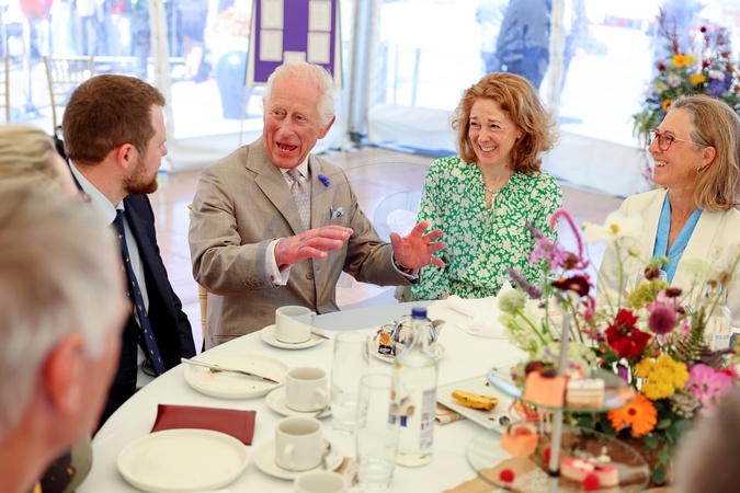 ST PETER PORT, GUERNSEY - JULY 16: King Charles III meeting guests at the tea party during a tour of the Island showcase exhibition, a showcase of Guernsey culture, heritage, produce and environmental initiatives on Crown Pier during an official visit to Guernsey on July 16, 2024 in St Peter Port, Guernsey., Credit:Chris Jackson / Avalon