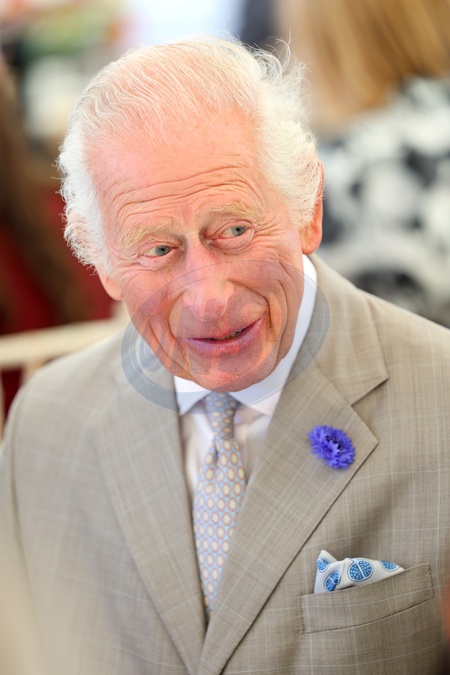 ST PETER PORT, GUERNSEY - JULY 16: King Charles III meeting guests at the tea party during a tour of the Island showcase exhibition, a showcase of Guernsey culture, heritage, produce and environmental initiatives on Crown Pier during an official visit to Guernsey on July 16, 2024 in St Peter Port, Guernsey., Credit:Chris Jackson / Avalon