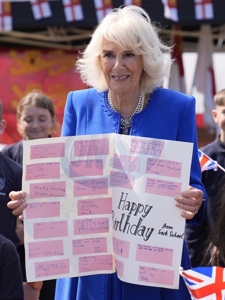 Guernsey, Channel Islands, 16 July 2024: Queen Camilla poses with local school children during a visit to Les Cotils at L'Hyvreuse, in Saint Peter Port, Guernsey during their two-day official visit to the Channel Islands., Credit:Andrew Matthews / Avalon