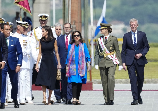 Król Felipe VI, królowa Hiszpanii Letycja i księżniczka Leonor podczas ceremonii przekazania zwolnień królewskich nowym oficerom Marynarki Wojennej w Marín