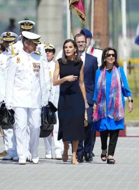 Le roi Felipe VI, la reine Letizia d’Espagne et la princesse Leonor lors de la cérémonie de remise des destitutions royales aux nouveaux officiers de la Marine à Marín