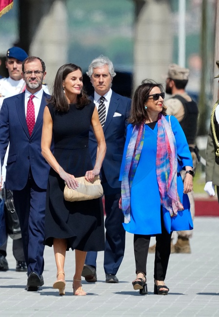 Le roi Felipe VI, la reine Letizia d’Espagne et la princesse Leonor lors de la cérémonie de remise des destitutions royales aux nouveaux officiers de la Marine à Marín