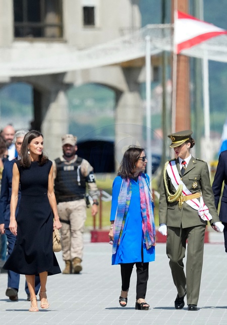 King Felipe VI (Le roi Felipe VI d'Espagne), Queen Letizia (La reine Letizia d'Espagne) and Crown Princess Leonor (La princesse Leonor) attend the delivery of Royal offices of employment at the Naval Military School on July 16, 2024 in Marin, Spain. © Lalo Yasky/Bestimage