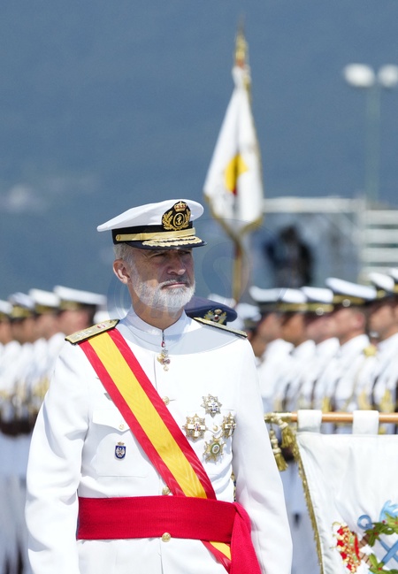 Król Felipe VI, królowa Hiszpanii Letycja i księżniczka Leonor podczas ceremonii przekazania zwolnień królewskich nowym oficerom Marynarki Wojennej w Marín