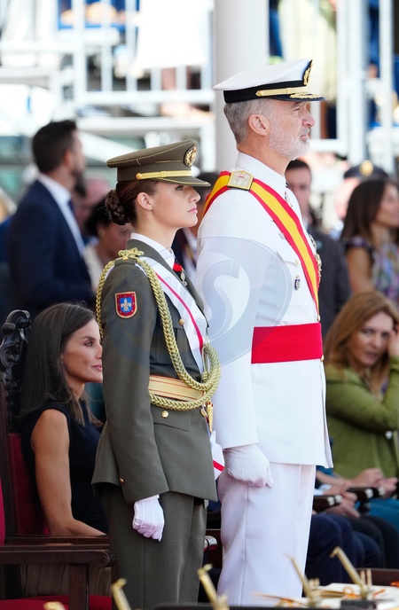 King Felipe VI (Le roi Felipe VI d'Espagne), Queen Letizia (La reine Letizia d'Espagne) and Crown Princess Leonor (La princesse Leonor) attend the delivery of Royal offices of employment at the Naval Military School on July 16, 2024 in Marin, Spain. © Lalo Yasky/Bestimage