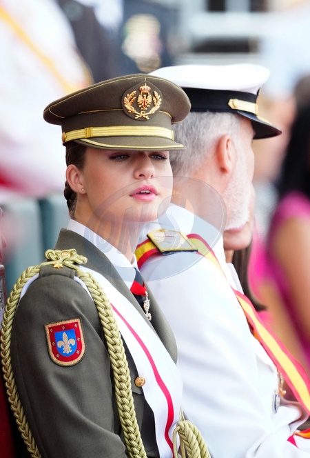 King Felipe VI (Le roi Felipe VI d'Espagne), Queen Letizia (La reine Letizia d'Espagne) and Crown Princess Leonor (La princesse Leonor) attend the delivery of Royal offices of employment at the Naval Military School on July 16, 2024 in Marin, Spain. © Lalo Yasky/Bestimage