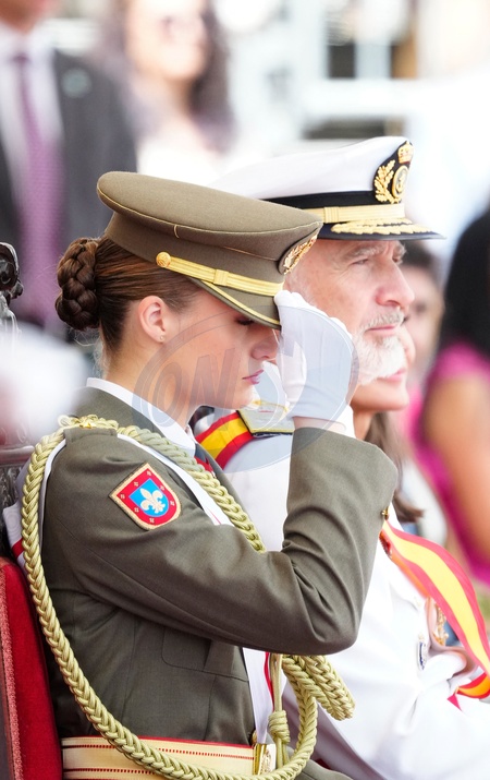 King Felipe VI (Le roi Felipe VI d'Espagne), Queen Letizia (La reine Letizia d'Espagne) and Crown Princess Leonor (La princesse Leonor) attend the delivery of Royal offices of employment at the Naval Military School on July 16, 2024 in Marin, Spain. © Lalo Yasky/Bestimage