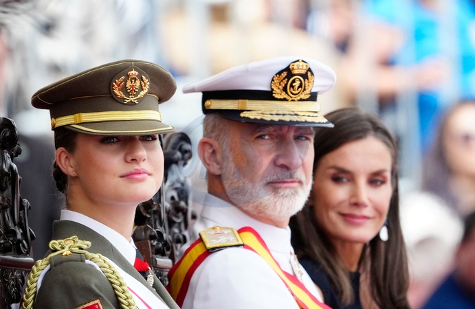 King Felipe VI (Le roi Felipe VI d'Espagne), Queen Letizia (La reine Letizia d'Espagne) and Crown Princess Leonor (La princesse Leonor) attend the delivery of Royal offices of employment at the Naval Military School on July 16, 2024 in Marin, Spain. © Lalo Yasky/Bestimage