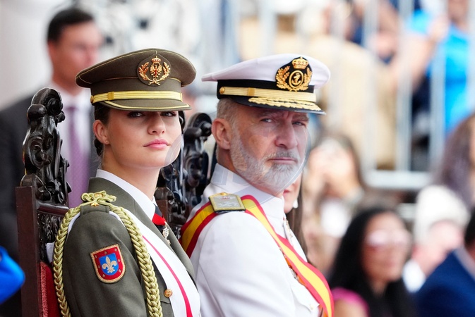 Król Felipe VI, królowa Hiszpanii Letycja i księżniczka Leonor podczas ceremonii przekazania zwolnień królewskich nowym oficerom Marynarki Wojennej w Marín