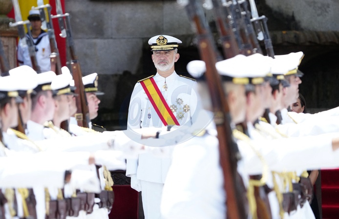 King Felipe VI (Le roi Felipe VI d'Espagne), Queen Letizia (La reine Letizia d'Espagne) and Crown Princess Leonor (La princesse Leonor) attend the delivery of Royal offices of employment at the Naval Military School on July 16, 2024 in Marin, Spain. © Lalo Yasky/Bestimage