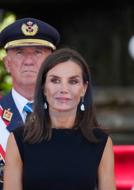 King Felipe VI (Le roi Felipe VI d'Espagne), Queen Letizia (La reine Letizia d'Espagne) and Crown Princess Leonor (La princesse Leonor) attend the delivery of Royal offices of employment at the Naval Military School on July 16, 2024 in Marin, Spain. © Lalo Yasky/Bestimage